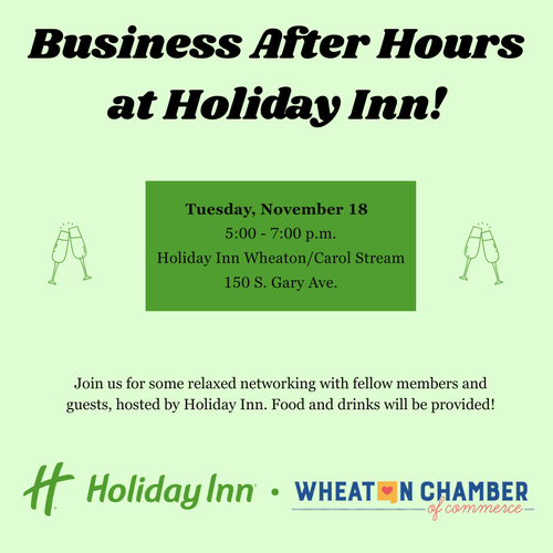 Come join us for our monthly Business After Hours, hosted by Holiday Inn & Suites Carol Stream. Join us for some relaxed networking with fellow member and guests. Make new connections while enjoying complimentary food & drinks. Appetizers and beverages provided by host! Advanced reservations are appreciated.